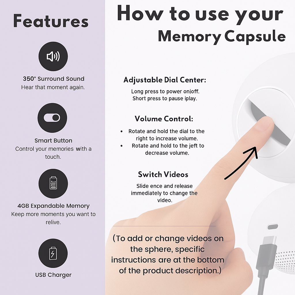 VideoGlow™ is a 3D crystal ball with a built-in screen that plays your personalized video. Simply connect it via USB-C and upload your file.